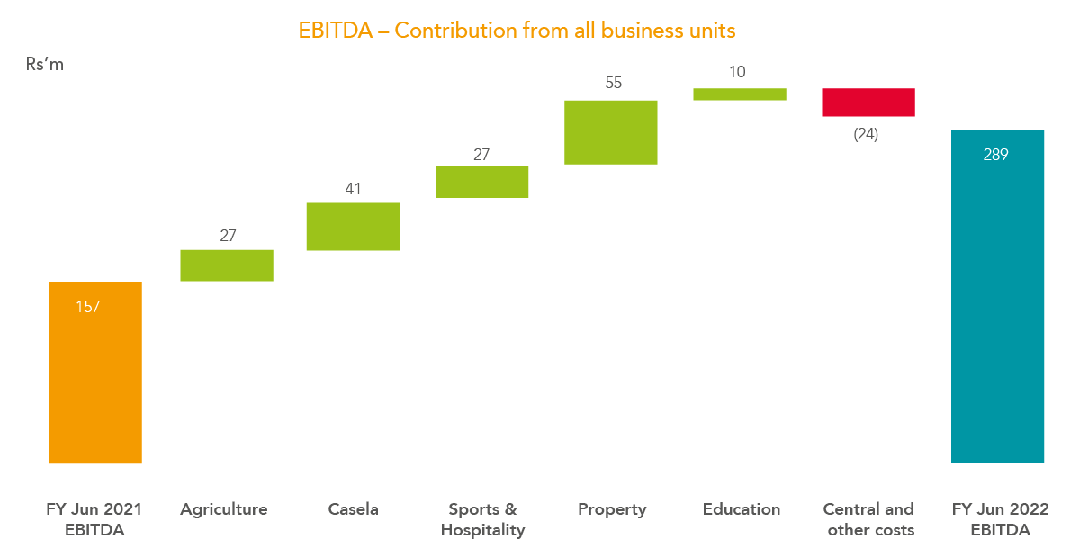 The Group’s commitment to its cost-containment strategy is reflected in the less than proportionate increase in operating expenses of 20% when compared to an increase of 28% in income, representing a Jaws ratio of 8%. The improved EBITDA figure of Rs 289m for this financial year, against Rs 157m from last year, was the result of the progress made in all business units, as depicted below.