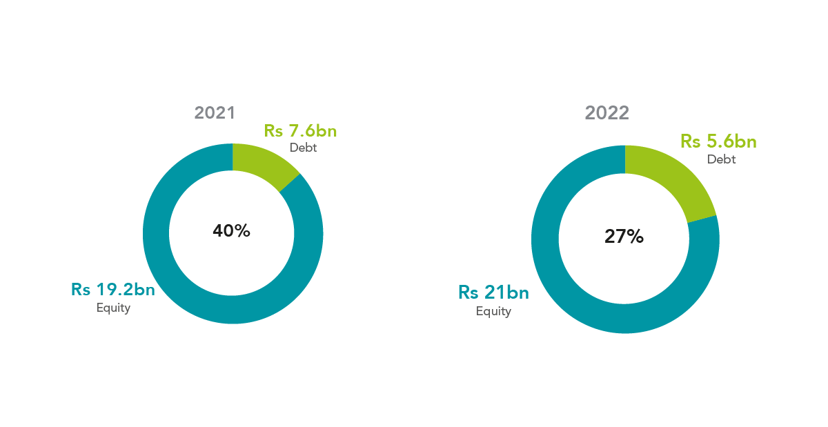 One of Medine’s strategic focus areas has been reducing our debt to a sustainable level of Rs 4bn. This year has seen the alignment of actions to achieve that strategy through the sale of land, creating an influx of cash for the repayment of debt. As of 30 June 2022, the net debt position was successfully reduced to Rs 5.6bn, down from Rs 7.6bn for last year, which simultaneously pushed our debt-to-equity ratio down from 40% to 27%.
